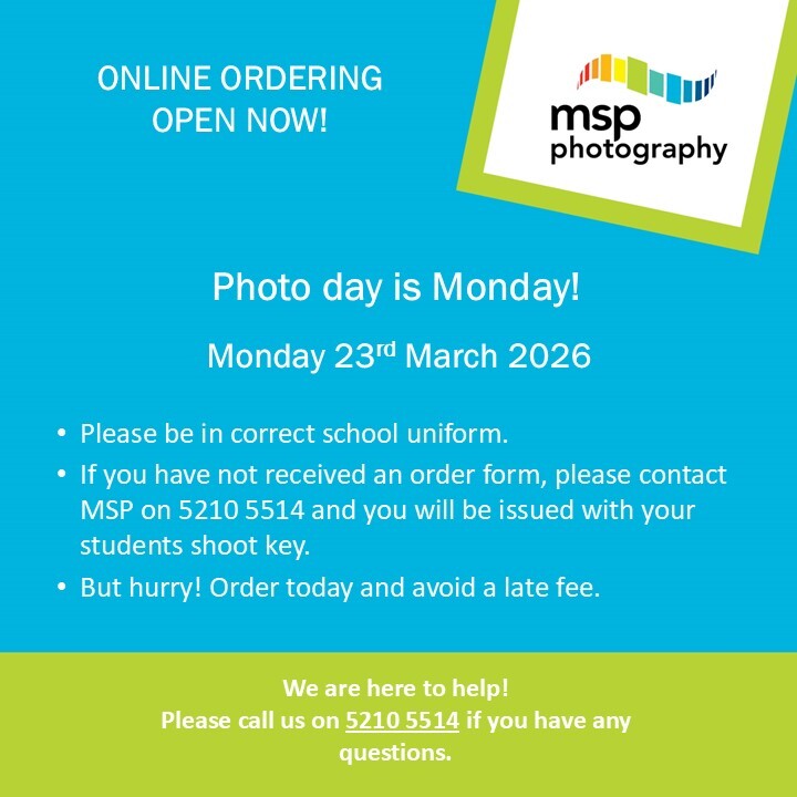 This is a reminder that our Stephen Street School photos will be taken on Tuesday, 31 March. All students are required to wear their Formal Uniform. If you have not received your Order Form, please contact MSP Photography on 5210 5514